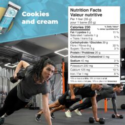 With 20g of high-quality whey protein and only 3g of sugar, our Cookies and Cream protein bars deliver the goods, along with a one-two punch of crunchy cocoa biscuits and luscious vanilla cream.