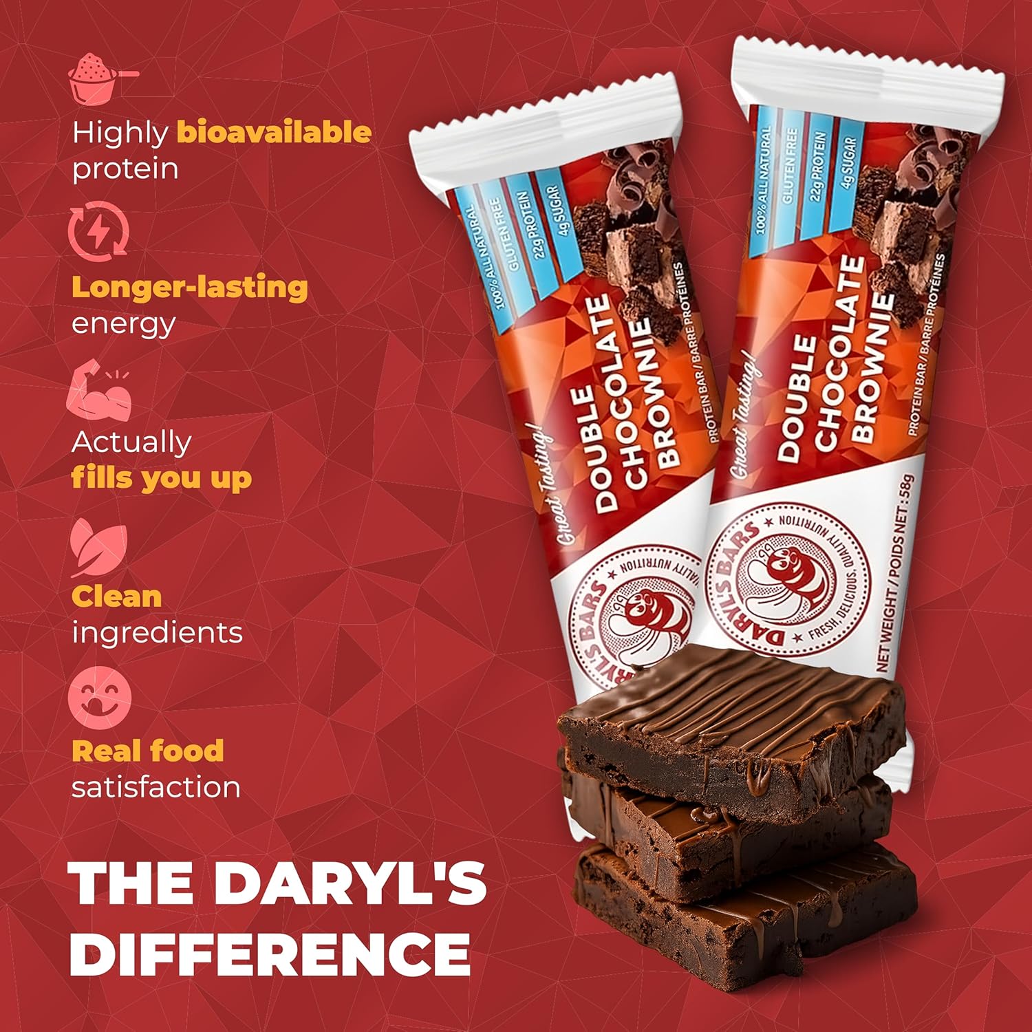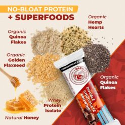With 22g of high-quality whey protein and only 4g of sugar, our Double Chocolate Brownie protein bars deliver the goods, along with the velvety delight of a chocolate brownie, layered with caramel and chocolate chips.