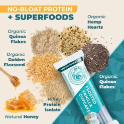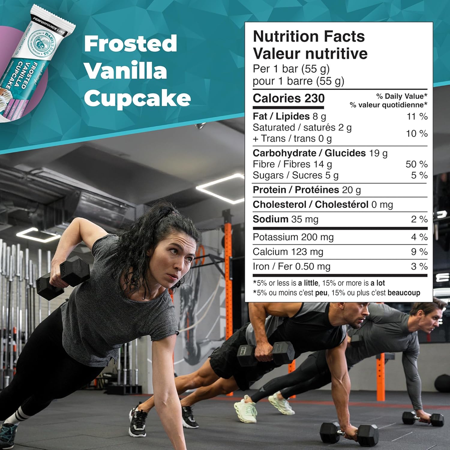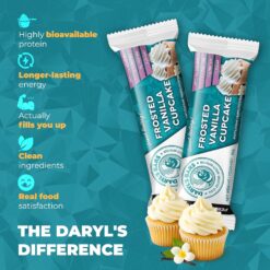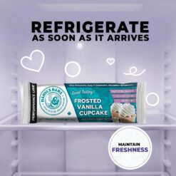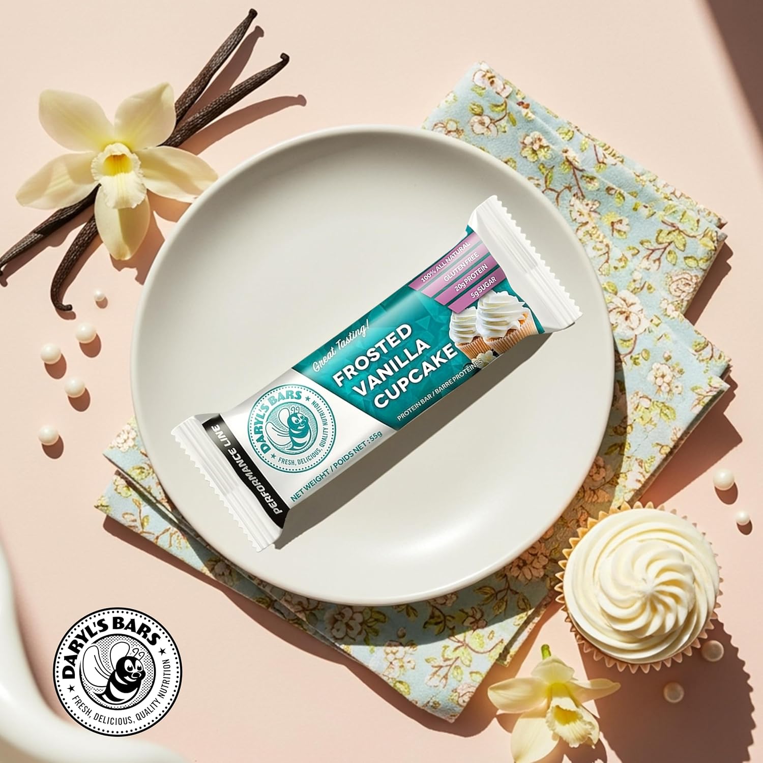 With 20g of high-quality whey protein and only 5g of sugar, our Frosted Vanilla Cupcake protein bars deliver the goods, along with a rich and naturally sweet flavour that truly satisfies.